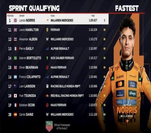 F1巴西站冲刺排位赛:诺里斯杆位,安东内利P2,汉密尔顿P11