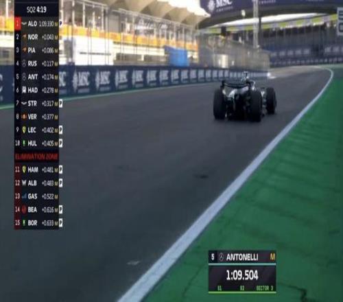 SQ2首轮飞驰圈结束,阿隆索处在榜首,两台迈凯伦排在二三,汉密尔顿处在淘汰区;