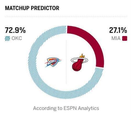 反观雷霆目前以35胜7负的傲人战绩稳居联盟榜首,展现出极强的竞争力。在短暂陷入低谷后,雷霆迅速以一波五连胜重振旗鼓,重拾赢球节奏与赛季初的王者之气。近3场比赛,雷霆在面对马刺、火箭等西部劲旅时毫不手软,不仅悉数拿下胜利,更在比赛中重现赛季初的统治级表现,攻防两端的压制力拉满。这波酣畅淋漓的连胜,不仅稳固了自身联盟第一的位置,更向全联盟彰显了他们冲击卫冕的坚定决心,状态正佳的他们无疑是本赛季夺冠的绝对热门。值得一提的是,本场热火与雷霆的比赛,ESPN给出的胜率预测,雷霆高达72.9%,热火只有27.1%的取胜机会。